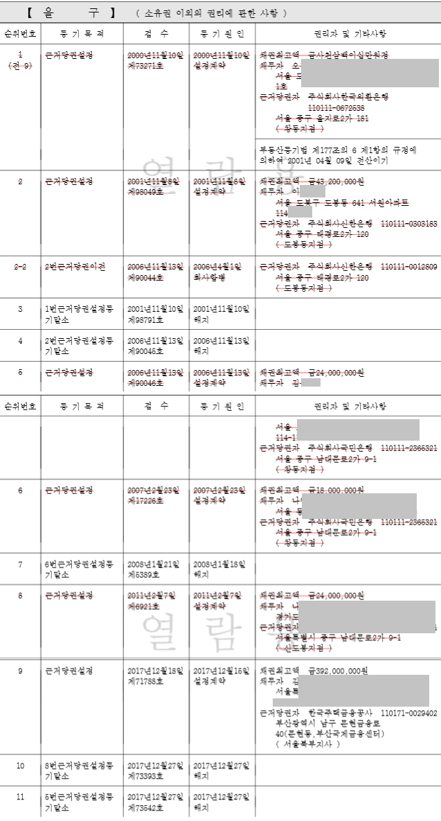 - 과거 은행 근저당(외환은행, 신한은행, 국민은행 등)이 있었으나 대부분 말소됨.