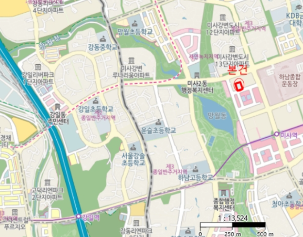 미사역에서 도보로 10분 거리에 위치해있고, 강남역까지 1시간 이내의 강남권.